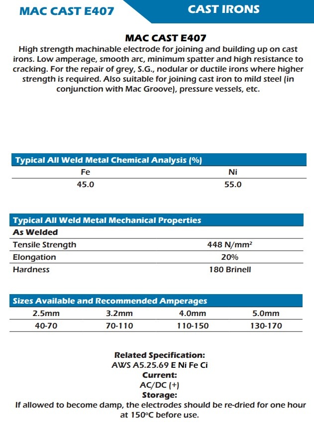 A good quality NiFe (Nickel Iron) electrode for the joining and building up of cast irons and joining cast iron to steel. This high strength machinable electrode offers a low spatter and high resistance to cracking. 55% Nickel 45% Iron AWS A5.15.69 Type E. Ni - Fe - Ci.