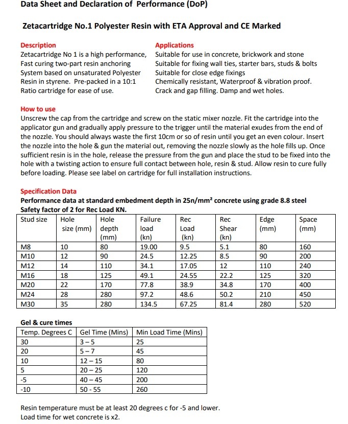 Zetacartridge No 1 is a high performance, Suitable for use in concrete, brickwork and stone. Fast curing two-part resin anchoring Suitable for fixing wall ties, starter bars, studs & bolts. System based on unsaturated Polyester, suitable for close edge fixings. Resin in styrene. Pre-packed in a 10:1
