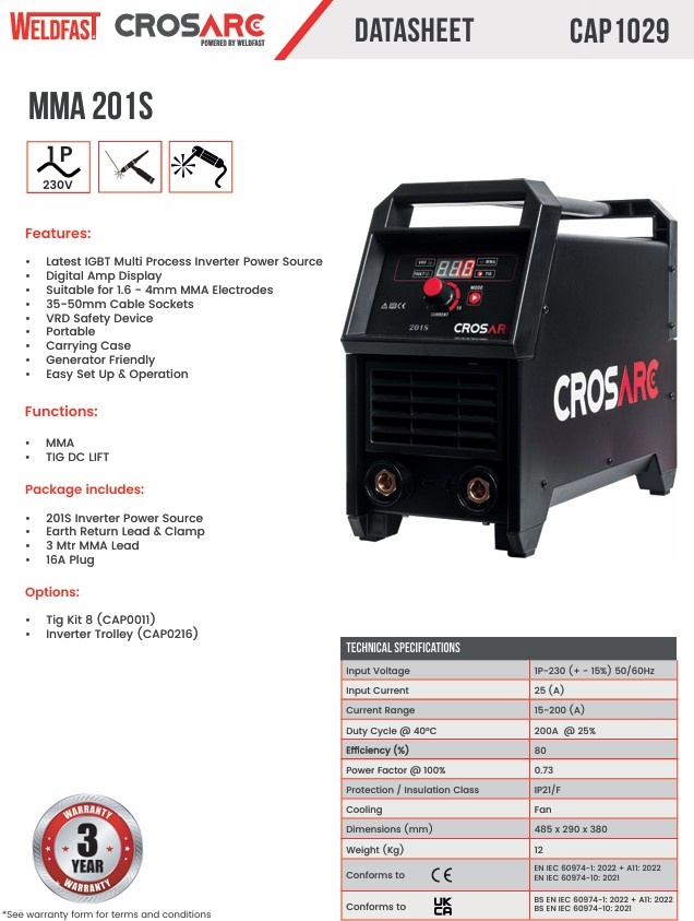 The CROSARC MMA 200s is a highly portable latest technology inverter based DC multi process power source operating from a 230v mains supply. This advanced DC MMA welding machine also offers TIG in DC with lift, it produces excellent arc characteristics with a range of electrodes and is the perfect solution to light fabrication and maintenance applications.