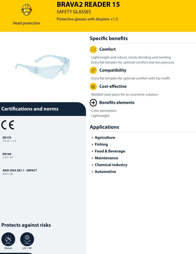 The Delta Plus BRAVA 2 Reader 15 are protective glasses with a split vision clear on top half and with a +1.5 diopter bottom half.