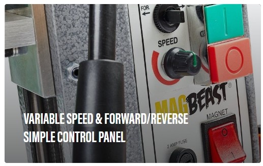 JEI's HM50T is a durable, heavy duty 2 morse taper magnetic drilling machine suitable for drilling and tapping. Weighing just 13 kilos with a 1150 watt motor (1250W on 240V model) this model has an impressive cutting capacity od 50mm diameter to a depth of 100mm, having two variable speeds and forward / reverse this model is ideal for tapping with a capacity up to M20, and a countersinking capacity up to 40mm, an unrivalled weight to cutting capacity ratio. Made in the UK this is a high quality machine that offers JEI's maintenance friendly twin slid rails, and adjustment free operation.
