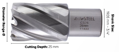 25mm cutting depth. Size range 23mm - 50mm diameter