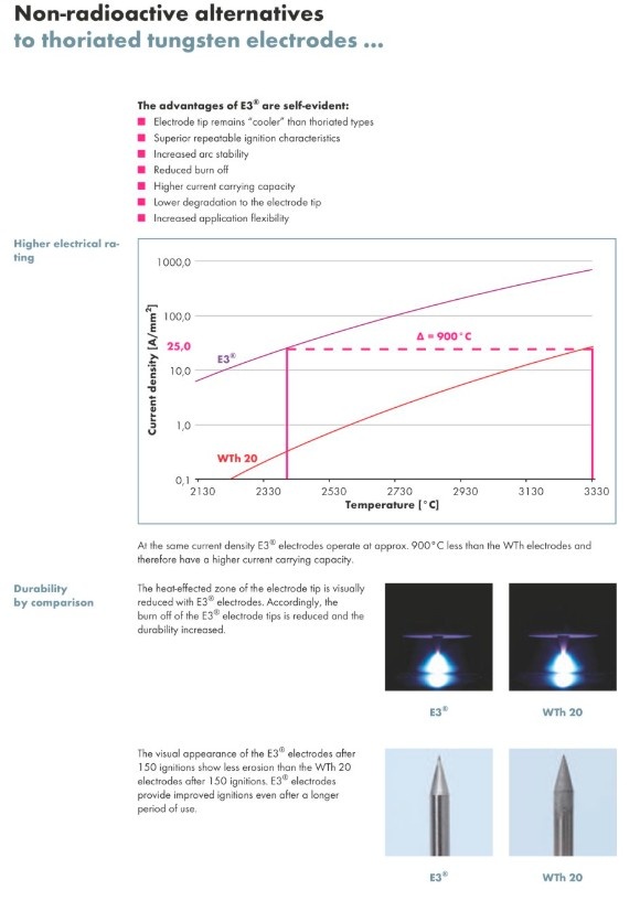 E3 Tungsten are electrodes with rare earth mixed oxides. Compared to thoriated electrodes, E3 is less harmful to the environment and not radioactive.