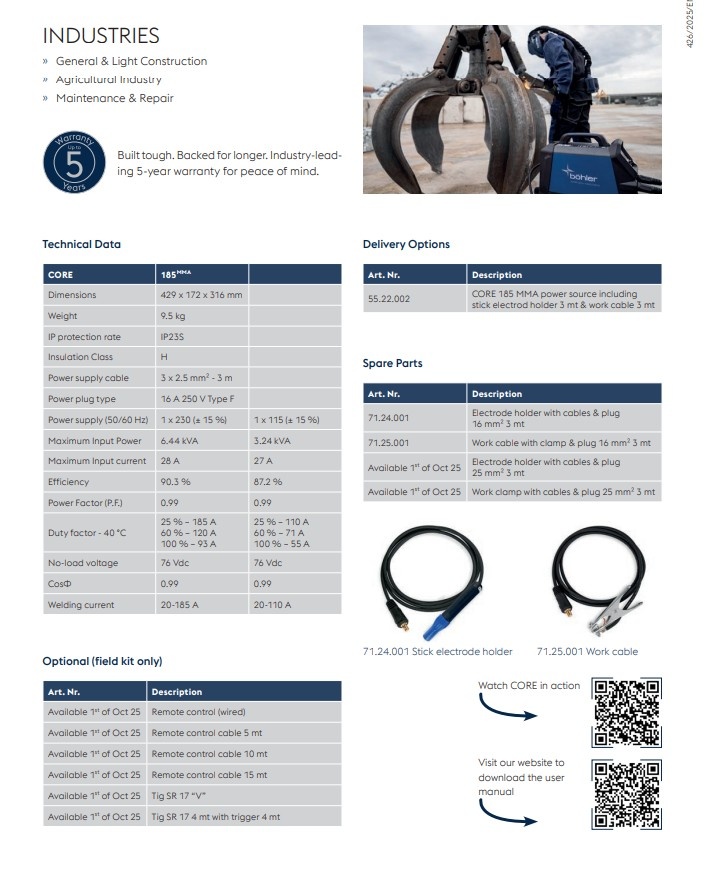 CORE 185MMA is a single-phase power source for MMA welding, MMA