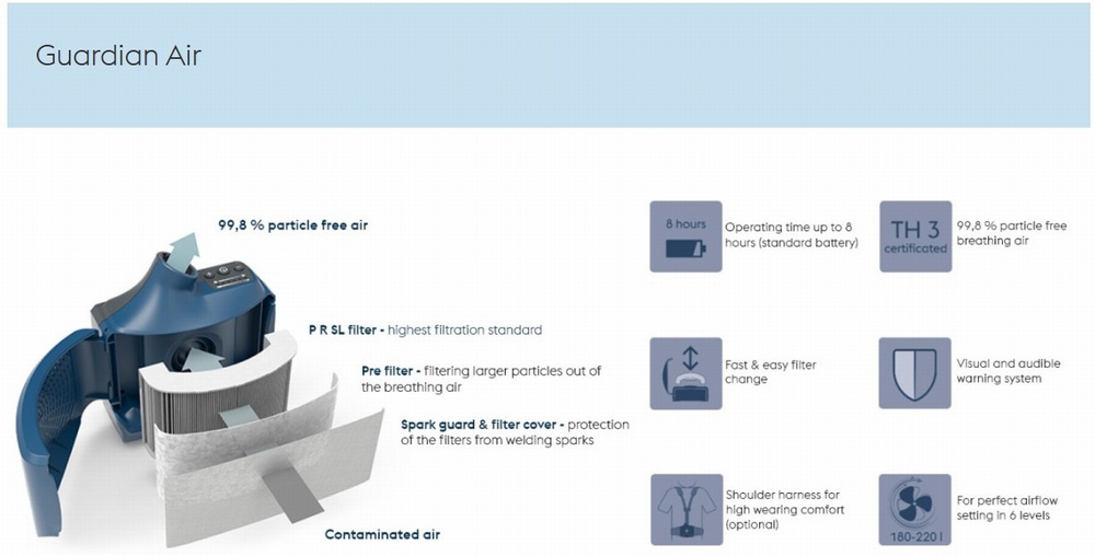 The Bohler Guardian air fed 50FM helmet is a new PAPR system meeting the highest level of TH3 certification. The ADF offers a viewing area of 50x100mm in the latest true colour technology, dark shade settings of 5-9 & 9-13.
