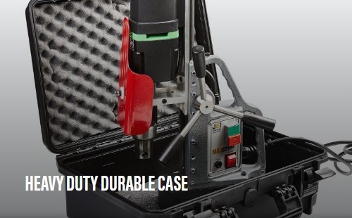 JEI's HM50 is a durable, heavy duty 2 morse taper magnetic drilling machine. Weighing just 13 kilos with a 1150 watt motor this model has an impressive cutting capacity of 50mm diameter to a depth of 100mm, and having two speeds this is suited to countersinking to a capacity of 40mm, an unrivalled weight to cutting capacity ratio. Made in the UK this is a high quality machine that offers JEI's maintenance friendly twin slid rails, and adjustment free operation.