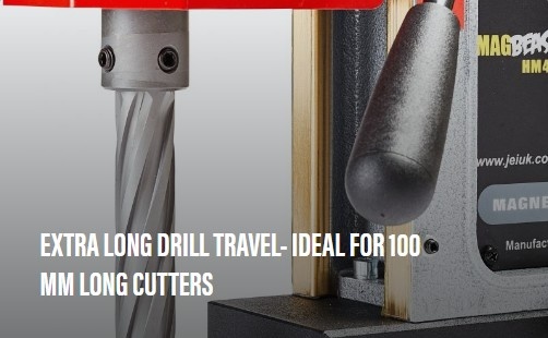JEI's HM50T is a durable, heavy duty 2 morse taper magnetic drilling machine suitable for drilling and tapping. Weighing just 13 kilos with a 1150 watt motor (1250W on 240V model) this model has an impressive cutting capacity od 50mm diameter to a depth of 100mm, having two variable speeds and forward / reverse this model is ideal for tapping with a capacity up to M20, and a countersinking capacity up to 40mm, an unrivalled weight to cutting capacity ratio. Made in the UK this is a high quality machine that offers JEI's maintenance friendly twin slid rails, and adjustment free operation.