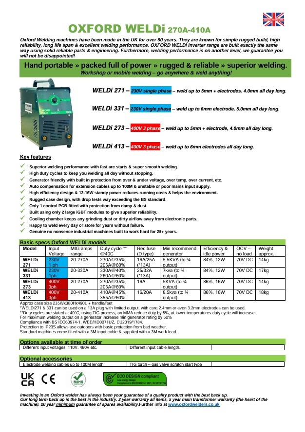 reliability, long life span & excellent welding performance. OXFORD WELDi Inverter range are built exactly the same