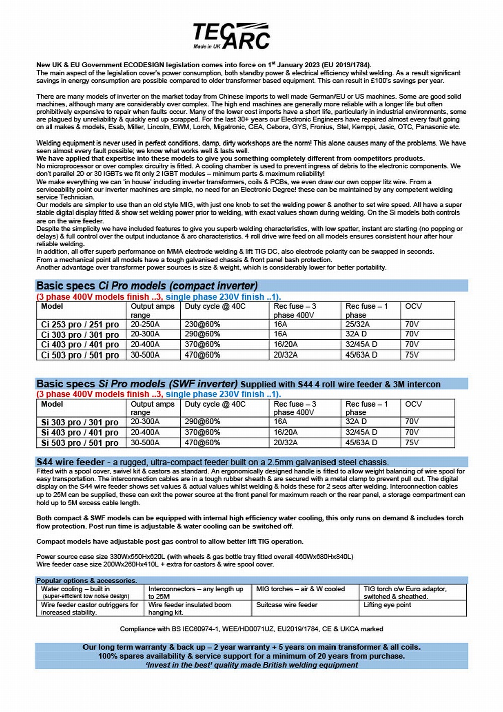 The TecArc Ci Pro welders are designed and manufactured in the UK for industrial use, the high duty cycle confirms this.